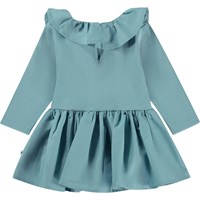 Lichtblauwe babyjurkje met lange mouwen van 100% biologisch katoen. Het heeft een schattige ronde kraag en een rok, beide in popeline. De jurk heeft drukknopen aan de achterkant.