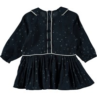 Prachtige, blauwe jurk met kraag, sterrenprint en een prachtige rok. Dankzij de knoopsluiting op de rug is de jurk makkelijk aan en uit te trekken.