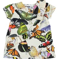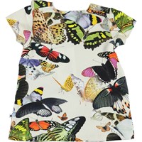 Cydney is een babyjurk in een print van een caleidoscoop van kleurrijke vlinders. De jurk heeft korte mouwen en schuine ruches aan de voorkant.