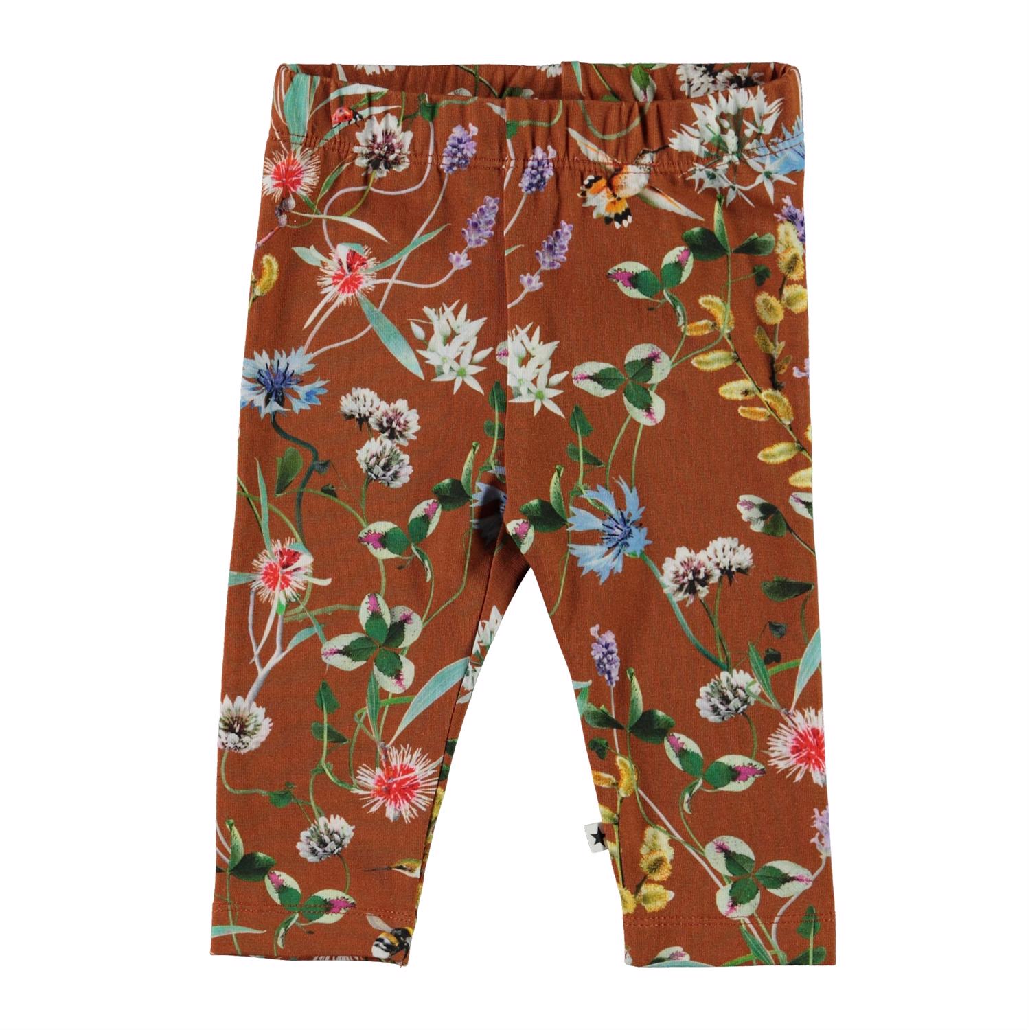 Stefanie is een bruine babylegging met een print van wilde bloemen. De elastische tailleband en zachte stof zorgen voor een goede pasvorm.