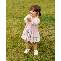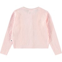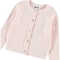 Roze gebreide vest van biologisch katoen voor de kleintjes. De vest is in een ribpatroon met ribboorden rond de mouwen, hals en onderkant. Het sluit aan de voorkant met kleine parelmoeren knoopjes.