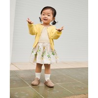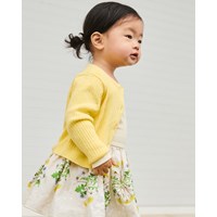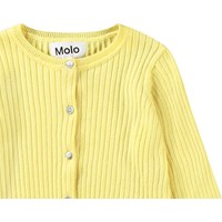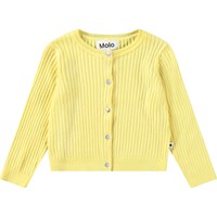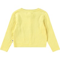 Gele gebreide vest van biologisch katoen voor de kleintjes. De vest is in een ribpatroon met ribboorden rond de mouwen, hals en onderkant. Het sluit aan de voorkant met kleine parelmoeren knoopjes.