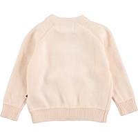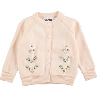 Gebreide babyvest met lange mouwen in het roze met knopen en borduurwerk op de voorkant. Het vest heeft geribde boorden op de mouwen en zoom.