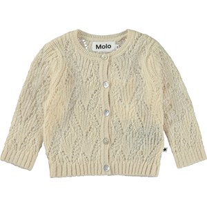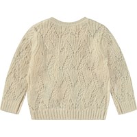 Gebreid babyvestje in gebroken wit. Het vest heeft een mooi gaatjes patroon en heeft een knoopsluiting aan de voorkant.