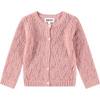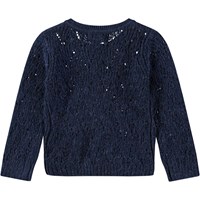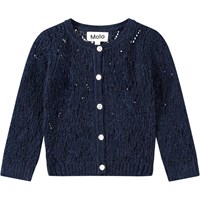 Donkerblauw gebreid vest voor baby's en peuters. Het vest heeft een mooi breipatroon en geribbelde boorden rond de mouwen, hals en taille. Het sluit aan de voorkant met kleine parelmoeren knoopjes.