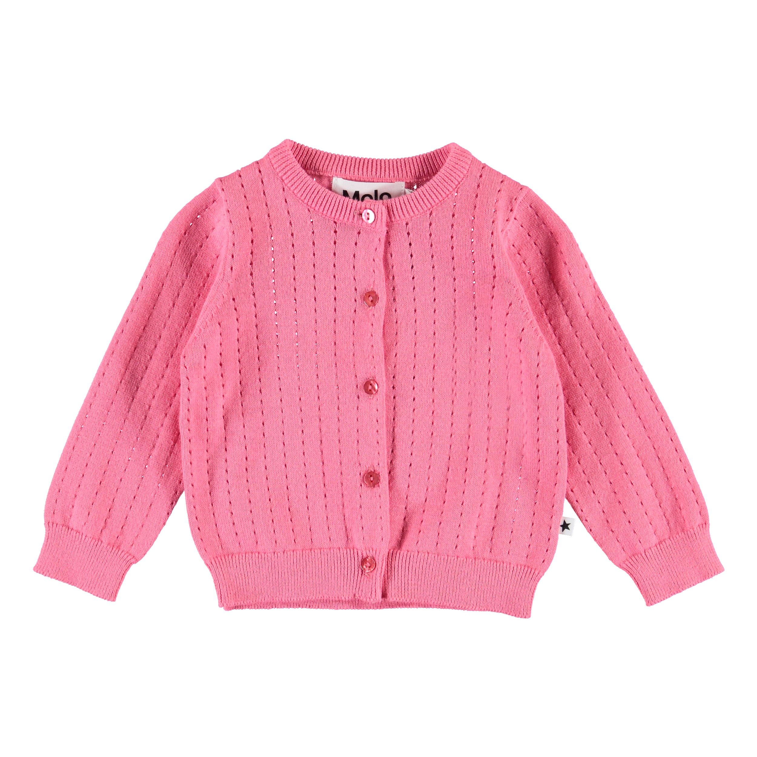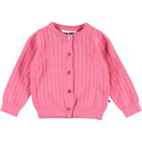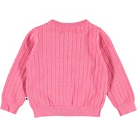 Ginny is een zalmkleurig gebreide babyvest met lange mouwen. Het heeft een prachtig breipatroon. Ginny heeft parelmoer gekleurde knopen aan de voorkant en rib aan de hals, mouwen en onderkant.