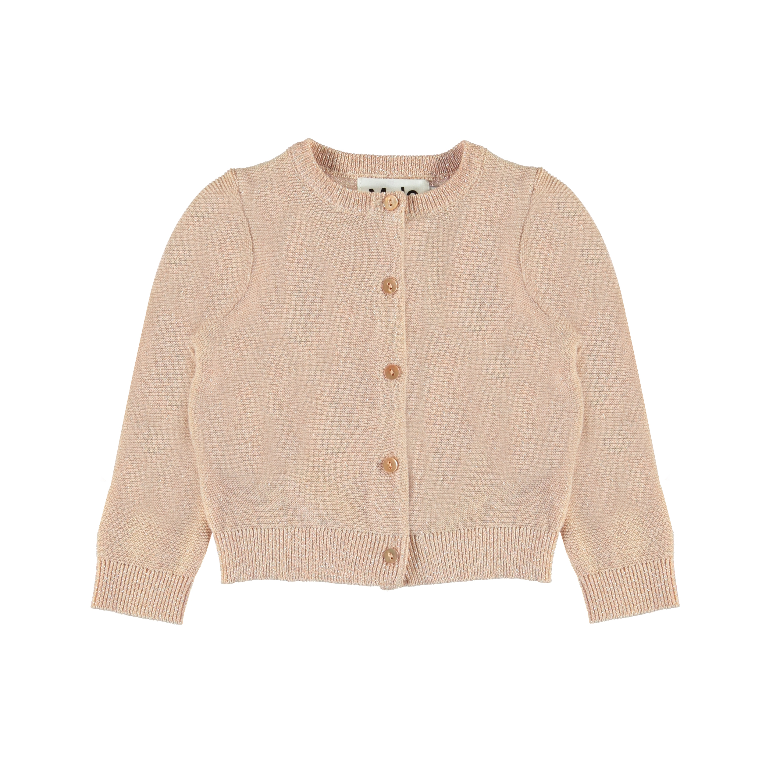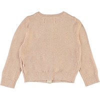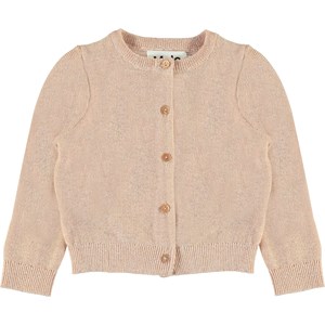 Ginny is een roze katoenen vest voor jonge kinderen. Het heeft knopen aan de voorkant en rib rond de hals, mouwen en onderkant.