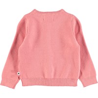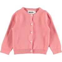 Donkerroze fijn gebreide katoenen baby vest met lange mouwen, parelmoerkleurige knopen aan de voorkant en ribboord aan de hals, mouwen en onderkant.