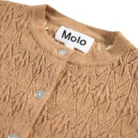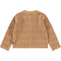 Bruine gebreide vest voor de kleintjes gemaakt van een mix van wol en katoen. Dit vest heeft een geweven patroon en heeft parelmoeren knoopjes..