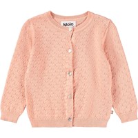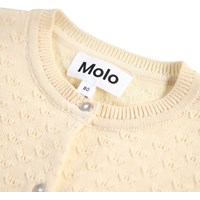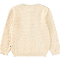Gebroken witte gebreid vestje voor de kleintjes gemaakt van biologisch katoen. Het vestje is gebreid in een bloemenpatroon, heeft een ronde hals, ribboorden en parelmoeren knoopjes aan de voorkant.