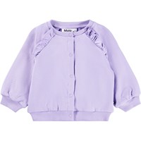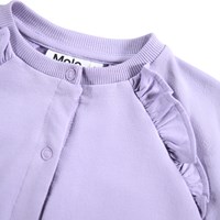 Lichtpaarse vest voor de kleintjes gemaakt van biologisch katoen. Het vest heeft raglanmouwen, drukknopen en ruches aan de voorkant. Het vest heeft ribboorden rond de hals, mouwen en taille.