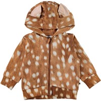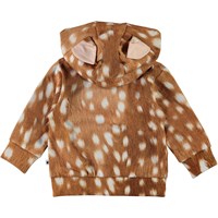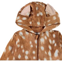 Demi is een bruine baby hoodie met een witte vlekkenprint. Op de capuchon zijn oren vastgenaaid.