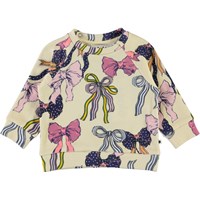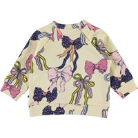Dicte is een lichtgele babysweater met een print van kleurrijke strikjes. De sweater heeft raglanmouwen en een kleine ruche rand aan de voorkant. Het heeft drukknopen aan de achterkant. Draag de sweater met een bijpassende broek.