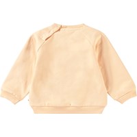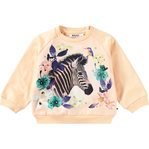 Perzikkleurige sweater voor baby's en peuters van biologisch katoenen jersey met een gevoerde binnenkant waardoor het zacht en warm is om te dragen. De sweater heeft raglanmouwen, geribbelde boorden rond de taille en mouwen, en een ronde hals met twee drukknopen aan de achterkant, waardoor het gemakkelijk is om aan en uit te trekken. Op de voorkant van de sweater staat een geplaatste print van een schattige zebra omringd door prachtige bloemen.