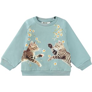 Lichtblauwe sweater voor baby's en peuters van biologisch katoenen jersey met een gevoerde binnenkant, waardoor het zacht en warm is om te dragen. De sweater heeft raglanmouwen, geribbelde boorden rond de taille en mouwen, en een ronde hals met twee drukknopen aan de achterkant, waardoor het gemakkelijk is om aan en uit te trekken. Op de voorkant van de sweater staat een print met twee schattige katjes die spelen met bloemen.