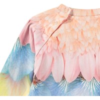 Sweater voor de kleintjes van zacht biologisch katoen. De sweater heeft raglanmouwen, ribborden, ronde hals en drukknopen achter op de schouder, waardoor het aan- en uittrekken makkelijk is. De sweater is kleurrijk met een print van bladeren en veren. Voor een complete set combineer je het met de bijpassende broek.