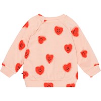 Roze trui voor kleine kinderen van biologisch katoenen jersey. De trui heeft ribboorden op de taillen en mouwen en heeft een ronde hals met twee drukknopen. Het heeft een lieve print van rode gespoten lachende hartjes. Voor een complete jersey set kun je het dragen met een bijpassende broek.