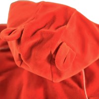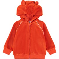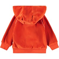 Rode hoodie voor de kleintjes gemaakt van zacht fluweel met witte biezen langs de raglanmouwen. De hoodie heeft vastgemaakte kleine oortjes op de capuchon. Combineer de hoodie met de bijpassende broek.