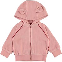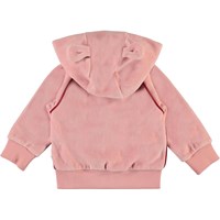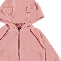 Dorothy is een roze fluwelen baby hoodie met opgenaaide kleine oortjes op de capuchon. Dorothy heeft een ritssluiting en mooie rode bies. Draag hem met de bijpassende broek.