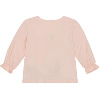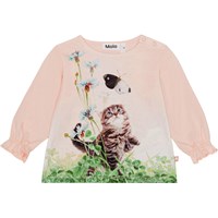 Roze shirt met lange mouwen van zachte, biologische katoenen jersey. Het heeft een ruimvallende pasvorm met schattige mouwen met elastiek aan de onderkant. Het heeft drukknopen op de schouder, zodat het gemakkelijk is aan te trekken. Het shirt heeft een schattige print van een vlinder en een speelse poes in een groen klaverveld.