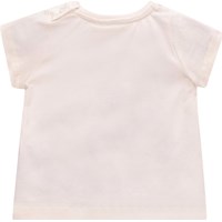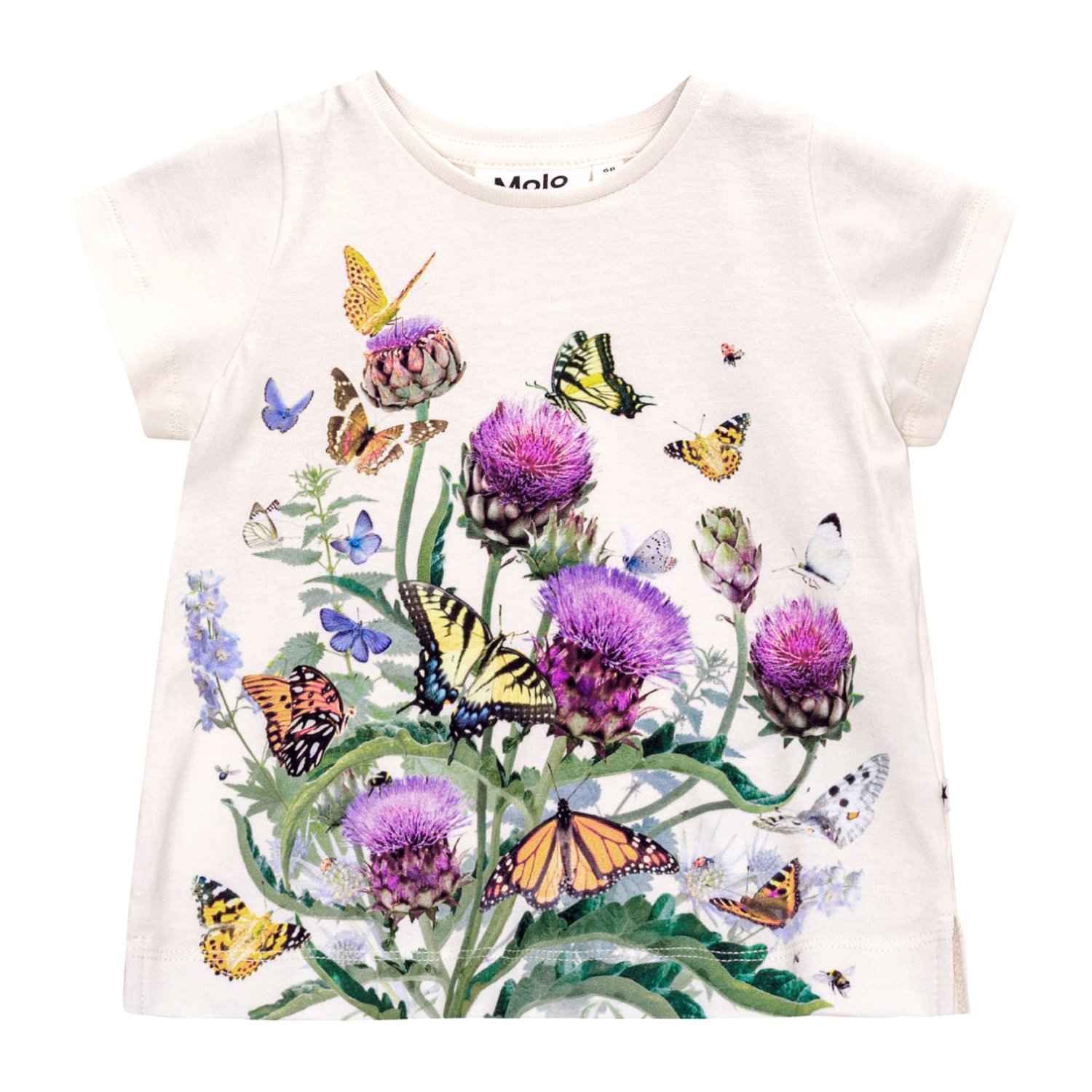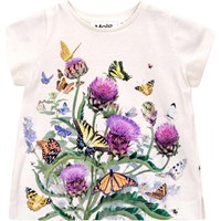 Gebroken witte t-shirt van zacht biologisch katoen. Het heeft een ruimvallende pasvorm en splitjes aan de zijkant. Het t-shirt heeft zeer korte mouwen en een sluiting met twee drukknopen op de schouder, zodat het gemakkelijk is om aan te trekken. Het t-shirt heeft op de voorkant een grote kleurrijke print van prachtige artisjokbloemen en fladderende vlinders.
