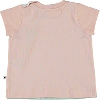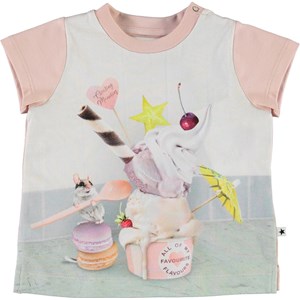 Elly is een roze baby t-shirt met op de voorkant een print van een ijsdessert. Het heeft drukknopen aan de achterkant.