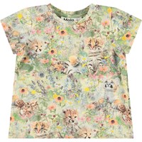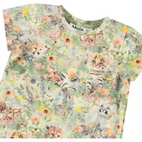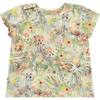 T-shirt voor de kleintjes van zacht biologisch katoen. Het t-shirt heeft een ruimvallende pasvorm, zijsplitten, korte mouwen en drukknopen op de schouder, waardoor het makkelijk is om aan en uit te trekken. Het t-shirt heeft een print van babydieren in een bed van bloemen.