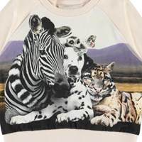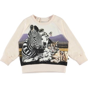 Maak contact met je dierenvrienden op de babytrui Elsa. Het is in een lichtroze kleur met de 'Close Together’ print, die een zebra, dalmatiërs, een luipaard, een aap en een vlinder omvat, die allemaal dicht bij elkaar staan. Elsa heeft raglanmouwen en drukknopen in de hals.