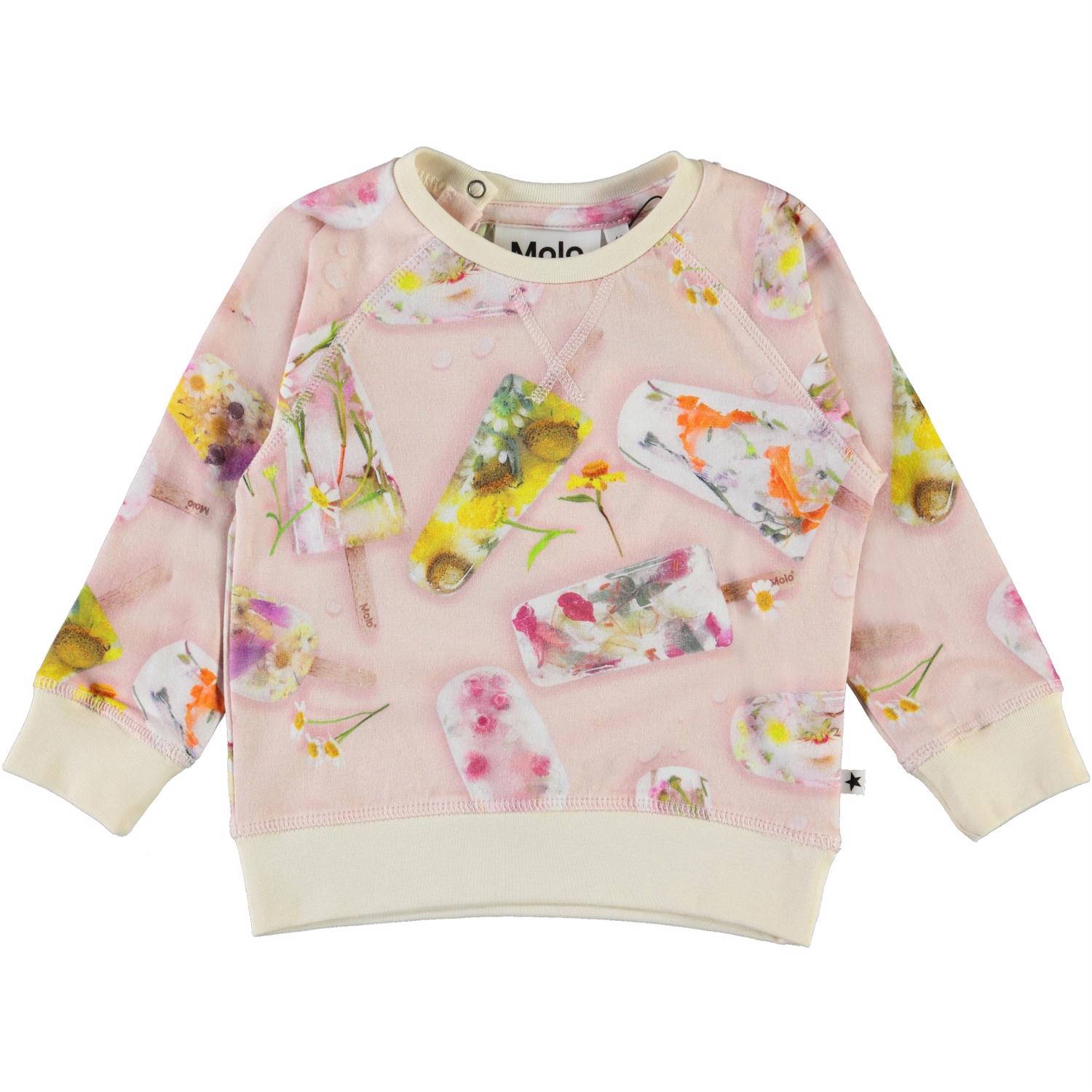 Elsa is een lichtroze babysweater met een ijsjesprint. Molo heeft prachtige bloemen ingevroren voor het maken van deze print. Elsa heeft beige ribboorden, raglanmouwen en drukknopen aan de achterkant.