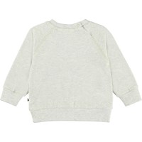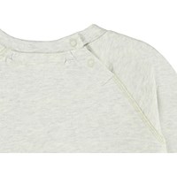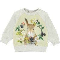 Elsa is een lichtgrijze babysweater met een print van een eekhoorn en bramen. Elsa heeft raglan mouwen en drukknopen rond de hals.