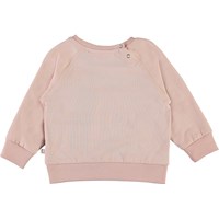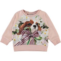 Elsa is een roze babysweater met op de voorkant een print van een puppy die zijn kopje door de bloemen steekt. Elsa heeft raglanmouwen en drukknopen aan de achterkant.