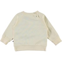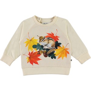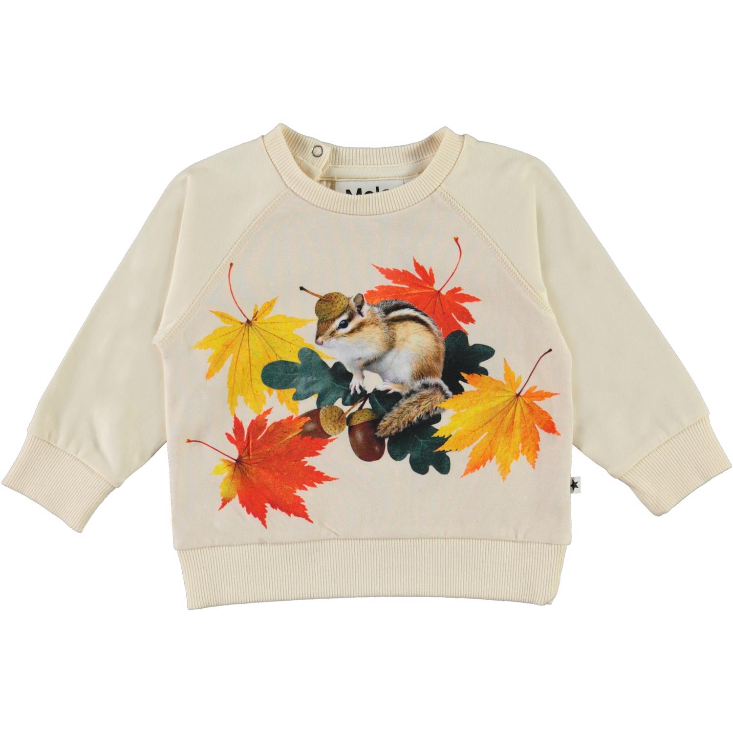 Elsa is een crèmekleurige babyshirt met op de voorkant een print van een eekhoorn met gouden blaadjes. Elsa heeft raglanmouwen en drukknopen aan de achterkant.