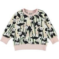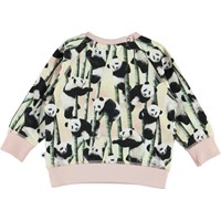 Elsa is een baby shirt met een print van panda’s en hun favoriete eten: bamboe. Het heeft raglanmouwen en een drukknoop in de nek.