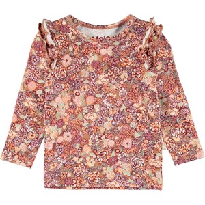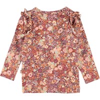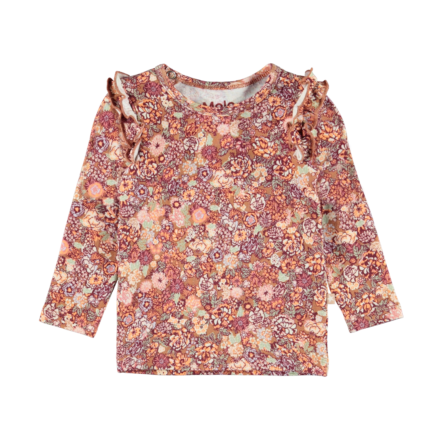Emma is een baby longsleeve met ruches en een print van bloemetjes. Het heeft lange mouwen met ruches aan de mouwen en drukknopen op een schouder.