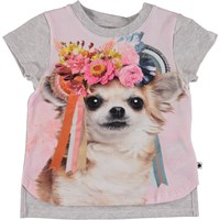 Erin is een grijs baby-t-shirt met een print van een feestelijke chihuahua. Erin is iets langer aan de achterkant en heeft grijze mouwen en een grijze rug.