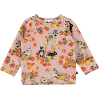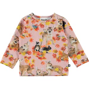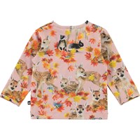 Eva is een roze babyshirt met een print van herten, konijnen en gouden bladeren. Het heeft drukknopen op één schouder.
