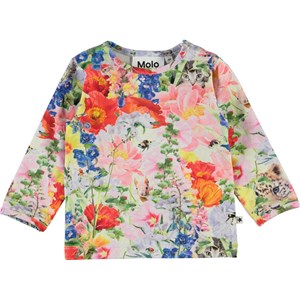 Eva is een babyshirt met een print van verschillende dieren zich tussen de bloemen verstoppen. Het shirt heeft drukknopen op één schouder.