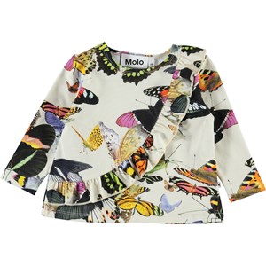 Evelyn is een baby shirt met een print van kleurrijke vlinders. Het shirt heeft lange mouwen en schuine ruches aan de voorkant.