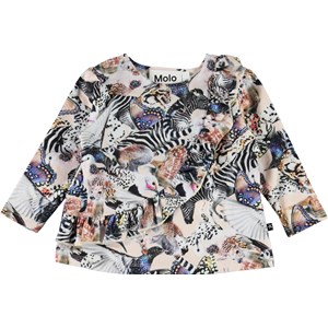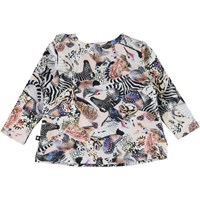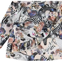 Evelyn is een babyshirt met een print van verschillende dieren die samen een cool patroon vormen. Het shirt heeft lange mouwen en schuine ruches aan de voorkant.