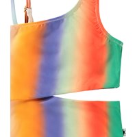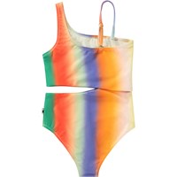Regenboogkleurig badpak van gerecycled polyester met UV-bescherming 50+. Het badpak heeft een normale pasvorm, zijnaden, is volledig gevoerd en heeft een asymmetrische brede schouderband en een dun verstelbare bandje voor een goede pasvorm. Het product is CE-gemarkeerd en getest volgens norm EN-13758-1.