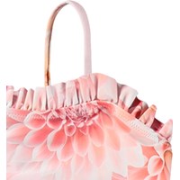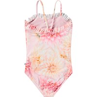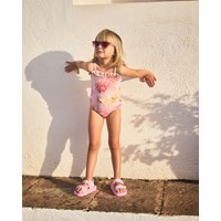 Badpak van gerecycled polyester met UV-bescherming 50+ gemaakt voor actieve kinderen. Het badpak heeft een normale pasvorm, dunne bandjes, ruche rand aan de bovenkant en is volledig gevoerd. Het is roze met een all over print van bloemen in lichte en roze tinten. Het product is CE-gemarkeerd en getest volgens norm EN-13758-1.