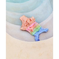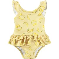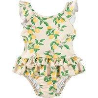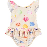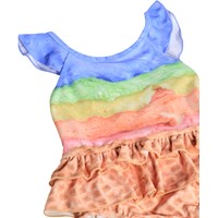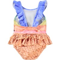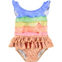 Regenboogkleurig badpak met ijsprint voor de kleintjes. Gemaakt van gerecycled polyester met UV-bescherming 50+. Het badpak heeft ruches, een diepe rug, elastiek rond de dijen en een gevoerde onderkant met ruimte voor een luier.