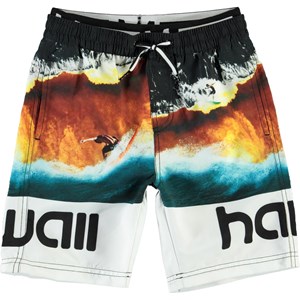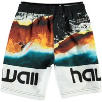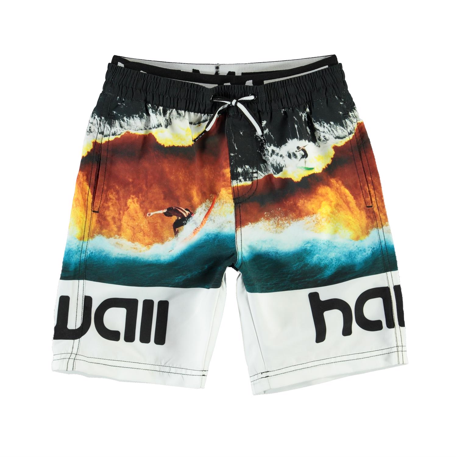 Neal is een nieuw Molo zwemshort met een lange, losse pasvorm en met een print van hoge golven en surfers met de tekst”Hawaii” aan de onderkant van de pijpen. Neal heeft een elastische tailleband met een stoer, geprint logo. Molo's zwemkleding heeft UV bescherming 50+. Het product is CE-gemarkeerd en getest volgens norm EN-13758-1.