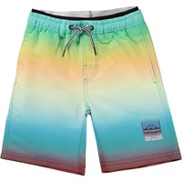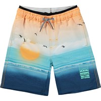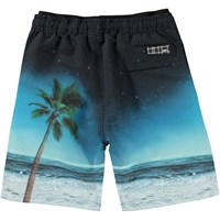 Zwemshort in donkere kleuren met een print van een tropische strand met zonsondergang, surfplanken en palmbomen. Het is van 100% gerecycled polyester en heeft lange pijpen. De zwemshort heeft koordjes en elastiek in de taille. zijzakken, een achterzak en een witte Molo Swim-logo op een pijp. Het heeft een ruimvallende pasvorm. Molo's zwemkleding heeft 50+ UV-bescherming. Het product is CE-gemarkeerd en getest volgens norm EN-13758-1.