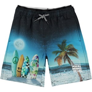 Zwemshort in donkere kleuren met een print van een tropische strand met zonsondergang, surfplanken en palmbomen. Het is van 100% gerecycled polyester en heeft lange pijpen. De zwemshort heeft koordjes en elastiek in de taille. zijzakken, een achterzak en een witte Molo Swim-logo op een pijp. Het heeft een ruimvallende pasvorm. Molo's zwemkleding heeft 50+ UV-bescherming. Het product is CE-gemarkeerd en getest volgens norm EN-13758-1.