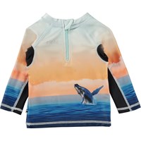 Roze zwemshirt met lange mouwen voor kleine kinderen. Het heeft een print op de voorkant van een paars aquarel Emoji. Het zwemshirt heeft een praktische ritssluiting aan de achterkant, zodat je het gemakkelijk aan en uit kunt trekken. Het is gemaakt van gerecycled rekbaar polyester en biedt een hoog niveau van 50+ UV-bescherming tegen de zon. Het product is CE-gemarkeerd en getest volgens norm EN-13758-1.