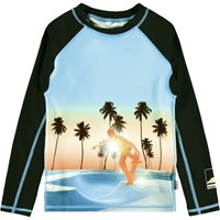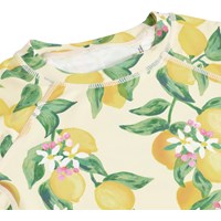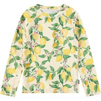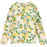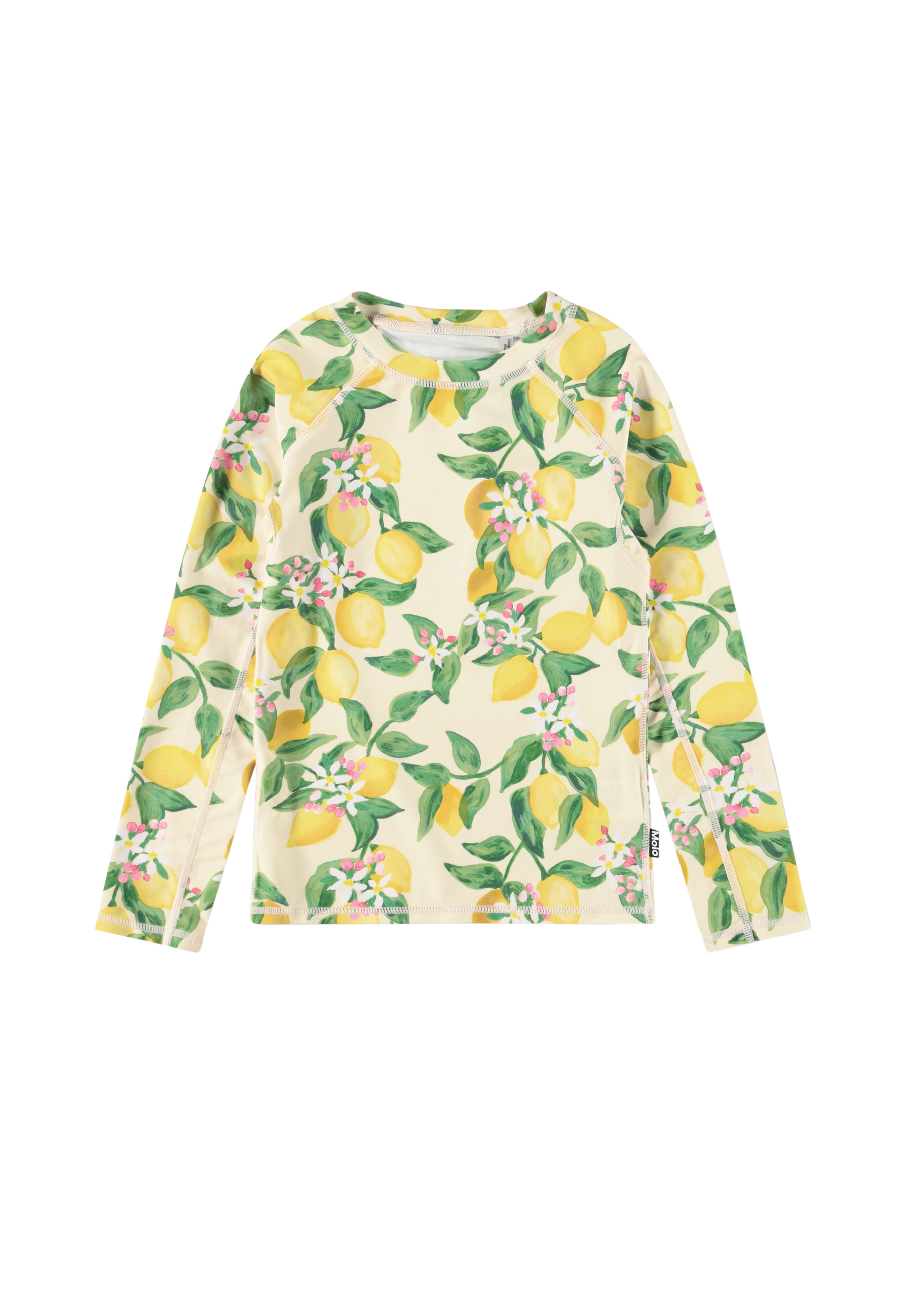 Zwemshirt voor actieve kinderen in geel met een citrusprint gemaakt van gerecycled polyester met UV-bescherming 50+. Het shirt heeft een nauwsluitende pasvorm, een opstaande kraag en lange raglanmouwen. Het rekbare materiaal zorgt voor hoog comfort en is perfect voor het strand en zwembad.