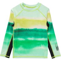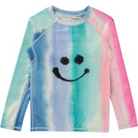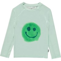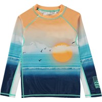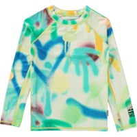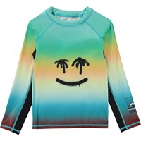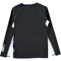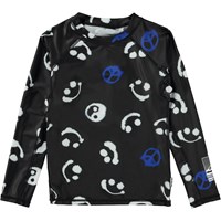 Zwart zwemshirt met op de voorkant een print van een tropisch strand met surfplanken en palmboemen. Het shirt heeft lange mouwen en op één ervan staat het Molo Swim-logo. Het is gemaakt van gerecycled polyester en heeft een lichtgewicht en comfortabele pasvorm en is gemakkelijk over het hoofd aan te trekken. Het biedt een hoog niveau van 50+ UV-bescherming tegen de zon. Het product is CE-gemarkeerd en getest volgens norm EN-13758-1.