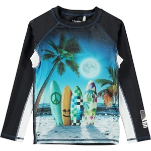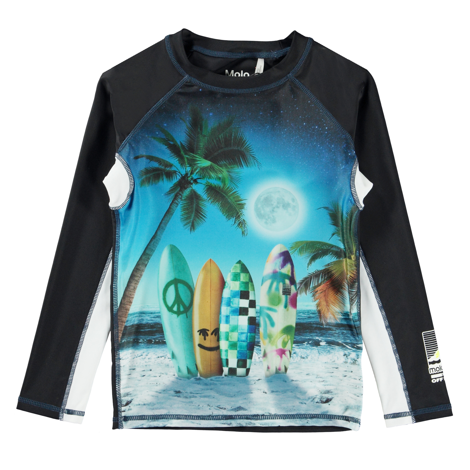 Zwart zwemshirt met op de voorkant een print van een tropisch strand met surfplanken en palmboemen. Het shirt heeft lange mouwen en op één ervan staat het Molo Swim-logo. Het is gemaakt van gerecycled polyester en heeft een lichtgewicht en comfortabele pasvorm en is gemakkelijk over het hoofd aan te trekken. Het biedt een hoog niveau van 50+ UV-bescherming tegen de zon. Het product is CE-gemarkeerd en getest volgens norm EN-13758-1.