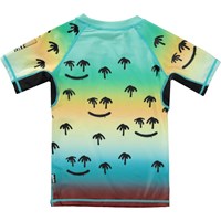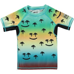 Zwemshirt in verschillende tinten geel, turkoois en blauw met een print van zwart gespoten palmbomen, waarvan sommige op lachende gezichten lijken. De top heeft korte mouwen en het Molo Swim-logo op één mouw. Het is gemaakt van gerecycled polyester en heeft een lichtgewicht en comfortabele pasvorm en is gemakkelijk over het hoofd aan te trekken. De top biedt een hoog niveau van 50+ UV-bescherming tegen de zon. Het product is CE-gemarkeerd en getest volgens norm EN-13758-1.